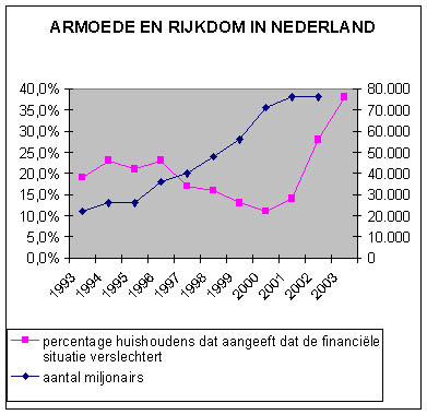 Het verschijnsel is inmiddels dieper in de samenleving doorgedrongen dan alleen het bedrijfsleven. "Ook top non-profit verdient uitstekend", kopt een kwaliteitskrant. De toppen van onder andere ABP, Bank Nederlandse Gemeenten, Nederlandsche Bank, ANWB, PGGM, Orbisch Medisch en Zorgconcern, Afvalverwerking Rijnmond en de Luchtverkeersleiding Nederland incasseerden meer dan twee maal het inkomen van de minister-president.3 Veel ophef is in 2004 ontstaan over de onterechte salarisverhogingen en periodieken die topambtenaren op het Ministerie van Onderwijs jarenlang ontvingen.4 Ook de hoogte van de het salaris van de directeur van de Nederlandse Hartstichting dat per saldo betaald werd uit giften, riep veel commotie op. En de meest recente categorie veelverdieners is te vinden onder de commissarissen van de koningin. Het resultaat laat zich raden. Bijgaande grafiek laat zien hoe armoede en aantallen miljonairs gelijktijdig groeien.5
